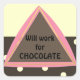 Un diseño divertido con un triángulo marrón chocolate con un borde rosa. Dice 'trabajará para el chocolate', un fondo de chocolate negro con puntos de polka blanco.