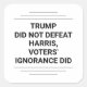 Pegatina con un texto y un diseño de líneas con una opinión política sobre la candidatura de Trump y Harris a la presidencia de Estados Unidos, diciendo "Trump no derrotó a Harris, la ignorancia de los votantes sí", porque aunque Harris superó a Trump por la mayoría de los indicadores, más votantes aún votaron por Trump. Puede personalizar de los elementos del diseño para que se adapten a su gusto, incluyendo el texto y el color de las líneas.
