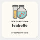 Pegatinas de cocina con un ilustracion lindo de un tubo de ensayo que contiene líquido amarillo y un matraz/vaso de precipitados redondeados que contiene líquido verde con burbujas rojas.