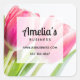 Pegatinas de negocios con una hermosa fotografía primaveral con 2 tulipanes rosados y hojas verdes brillantes.