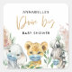 Los animales de la ducha de bebé desconocidos y de género lindo en máscaras transmiten una ducha de bebé virtual. Flores blancas: follaje botánico y elefante, león y cebra con máscaras faciales. Texto del guión, parte de una colección disponible de diferentes formas de color.