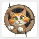 Esta imagen muestra un gato personalizado naranja con ojos verdes brillantes y una expresión alegre y juguetona. El gato está mirando a través de un agujero redondo de madera, mostrando una decoración curiosa y caprichosa. El marco de madera está decorado con grietas y texturas, lo que aporta un toque de realismo, mientras que el diseño general sigue siendo vibrante y lleno de vida