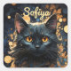 Un ilustracion de un majestuoso gato negro misterioso con un purpurina de círculos y estrellas. Puedes personalizar el nombre.