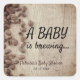 Una fiesta de baby shower con pegatinas de café y granos de café sobre un fondo de madera rústica.