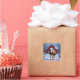 Pegatinas con el ilustracion de una vaca festiva en un sombrero de Santa parada frente a un granero rojo adornado con luces de Navidad y una corona festividad en un día de invierno nevado. Estos son tan lindos para sellar las tarjetas de tus Navidades o las bolsas de favores de tu partido.