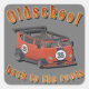 El diseño incluye una furgoneta roja de estilo retro con el número "35" en la parte delantera y lateral. El autobús tiene un diseño de ajuste distintivo con un techo cortado y un gran spoiler trasero, lo que le da un aspecto de carrera y de barra caliente. Encima está escrito "Oldschool" en un llamativo tipo de letra vintage, mientras que debajo de la frase "back to the roots" subraya el carácter nostálgico del diseño. La paleta de colores incluye tonos cálidos retro como el rojo, el beige, el naranja y el negro.