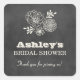 La magnífica ducha de boda con forma de novia favorece a los pegatinas en forma de cuadrado, con un suave fondo rústico de tablero negro con un aspecto texturado, un ramo de flores esbozado y un elegante texto personalizado con un aspecto de tiza blanca.