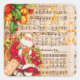 Una encantadora y tradicional pegatina navideña con partituras victorianas con villancicos de Navidad y el encantador y anticuado Santa Claus (o Papá Noel) en la esquina, con hojas huecas, bayas rojas y campanas encima de él.