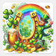 Un ilustracion vibrante con un leprechaun, una herradura, trébol de cuatro hojas, monedas de oro y un arco iris. En la parte inferior izquierda hay una jarra espumosa de cerveza dorada-amarilla que añade otro elemento al tema de la suerte Los colores son vivos y llamativos, y la impresión general es de buena fortuna, suerte y celebraciones irlandesas.