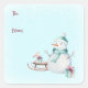 The words "To" and "From" and a winter snowman next to sled with Christmas gifts and a cute bird highlight these holiday gift stickers.