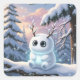 criatura nevada blanca adorable y esponjosa con ojos grandes y oscuros y pequeñas gargantas de ramas. Está sentado en una rama cubierta de nieve, en un bosque invernal, con pinos cubiertos de nieve y un cielo con puesta de sol de color pastel al fondo. La criatura brilla ligeramente y los copos de nieve caen alrededor de ella.
