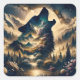 Imagen dentro de una imagen. Un lobo aullando en la luna con un fondo de montaña y bosque.
