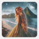 A beautiful woman walks along a tropical beach, wearing a grass skirt and a hibiscus in her hair.