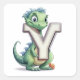 Esta imagen representa un adorable dragón verde con acentos azules sobre su escudo, sentado al lado de la letra "Y", diseñada con una textura de madera y un contorno blanco. El dragón tiene una expresión lúdica y curiosa, con ojos grandes y amigables, y está sentado en una posición relajada con una pequeña flor roja por la cola. El suave sombreado y la cuidadosa atención a los detalles crean un carácter encantador y atractivo, perfecto para un libro de alfabetos infantil o material educativo.