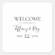 Este sencillo y elegante pegatina cuadrado de bienvenida es perfecto para su moderno minimalista boda blanco y negro. El diseño presenta un tipo de letra contemporáneo mínimo acompañado de caligrafía formal. ¡Manténgalo como está, o elige personalizarlo con tu propia obra de arte o fotos!