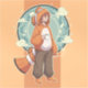 A cozy and cute anime-style illustration of a boy wearing an orange clownfish outfit while enjoying a cup of coffee.
