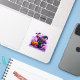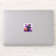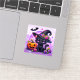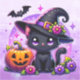 Un adorable pegatina de Halloween que presenta un lindo gato negro en el gorra de una bruja con una calabaza. murciélago y adorables elementos morados y naranjas.