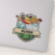 This personalized sticker features a smiling yellow and red firefighting airplane spraying water over a happy forest with cheerful trees and clouds.