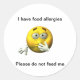 Este pegatina de Alergia Alimentaria presenta una "cara emoticono" personalizado con una expresión de mal gusto y un texto "Tengo alergia a la comida - Por favor no me alimentes" Ideal para niños pequeños, se pega a su lonchera o ropa para un viaje de un día.