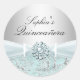 Pegatina de Quinceanera. Giro floral azul y plateado con arco y joyas. Zazzle exclusivo. Personalizar con sus propios detalles. POR FAVOR, NOTE todas las imágenes planas! ¡¡NO tienen plata real, arcos, diamantes ni joyas!!