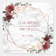 Moderno y a la moda, este diseño pegatina boda presenta un falso cobre geométrico adornado con vegetación eucaliptus acuarela y arreglos florales borgoñas y rosas, sobre una textura de mármol blanco falso. Los nombres de la pareja y la fecha del boda están en un color burdeos similar. Parte de un conjunto de coincidencias. Copyright Elegant Invita. Todos Los Derechos Reservados.