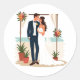 Incluye 20 pegatinas pequeños en una hoja. Delicado ilustracion de una novia y un novio que comparten un beso bajo un arco floral en la playa, perfecto para personalizar regalos.