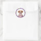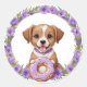 Feliz cachorro con un donut. Flores moradas, lindas y divertidas!