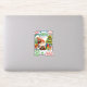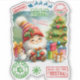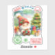 Una deliciosa pegatina de Navidad muestra a un lindo personaje vestido en un alegre gorra, sentado junto a una taza de cacao humeante.