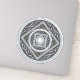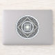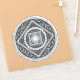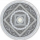 Esta mandala fue diseñada para el signo del zodiaco, el cáncer, que representa una piedra de luna en el centro rodeada de elementos que representan el signo, como el símbolo del signo, la constelación y el símbolo alquímico del agua, así como las viñas y cuevas de filigree que la envuelven en una imagen sólida en tonos de blanco-azul, plata y gris.