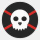 Un cráneo blanco con una X roja detrás sobre un pegatina negro.