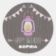 Pegatina de cumpleaños temática acampada con un ilustracion de una linterna violeta y un racimo. El fondo es de madera. Personalice el texto. Busque invitaciones coincidentes en Jill's Paperie.