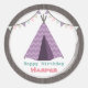Pegatina de cumpleaños temática de camping con un ilustracion de tipi de chevron violeta y bunting. El fondo es de madera. Personalice el texto. Busque invitaciones coincidentes en Jill's Paperie.