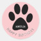 Papel Imprimir Pegatina Rosa Feliz Cumpleaños con Nombre. El pegatina cuenta con una huella de pata de perro negro con un nombre y un texto de cumpleaños Happy en un fondo rosado. Personaliza el nombre con el tuyo. Ideal como un pegatina de envoltura de regalo o accesorio de correo para un chica o un niño que celebra un cumpleaños.