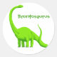 Gráficos Guay de dinosaurio Brontosaurus verde. El texto verde debajo de ellos dice Brontosaurus. Gran fiesta de cumpleaños o sello para sobres para un fiesta infantil con temática de dinosaurio.