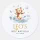 Sella tus recuerdos de fiesta con encanto utilizando esta pegatina de cumpleaños de un oso de acuarela. Diseñada con un osito de peluche pintado a mano flotando sobre nubes esponjosas, estrellas doradas y notas musicales juguetonas, esta pegatina redonda añade un toque caprichoso a la celebración de tu bebé. Los tonos pastel y las texturas suaves la hacen perfecta para una fiesta temática de cuento de hadas acogedor.