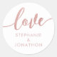 Un efecto de lámina de oro rosa falso / oro rosa suave y una etiqueta blanca para sellar el embalaje de tus favores de boda, invitación o sobres de "save the date", y etiquetar favores de boda o de fiesta de soltera. La etiqueta tiene espacio para nombres, fecha u otro texto personalizado y "amor" en un diseño de letra de caligrafía. • • • • Haz clic en PERSONALIZAR MÁS para cambiar la fuente o el color del texto, y para agregar más texto o reorganizar el arte como desees para crear tu propia etiqueta de tema de amor personalizada. • • • • • La tienda de diseño de Zazzle de The Paper Grape tiene otras formas y artículos coordinados.