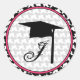 Un pegatina de graduación con una cabina de patas gordas con un ilustracion de un gorro negro de graduación dentro de un marco rosado caliente. Personaliza con tu inicial.
