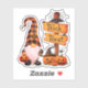 Un pegatina de Halloween con un Gnome y calabazas sonrientes.