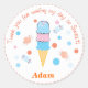 Pegatina de helados Whimsical de color azul claro. Ideal para bufés de caramelos o mesas de quequitos en bodas, fiestas de cumpleaños, duchas para bebés, Comunión, confirmaciones y mucho más! El diseño presenta una cuchara triple helado y cono con bolas de goma naranja y azul y caramelos envueltos flotando sobre un fondo blanco con un círculo exterior azul claro. "¡Gracias por hacer a mi fiesta tan dulce!". El nombre del niño se coloca bajo la máquina de la bola de goma. Puede cambiar este texto en el menú "Personalizar". Si desea un pegatina diseñado por un personalizado, haga clic en 'Contactar' y rellene sus requisitos. Diseño por firedropdesign.com