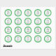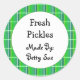 Un pegatina de enlatamiento o horneado personalizado con escritura a mano y letras en bloque sobre un patrón retro de enlucido verde con pequeñas rayas blancas y azules para pepinillos, mermeladas u otras recetas.