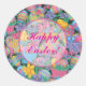 Pegatina redonda con una imagen de cestas de Pascua rosa, azul, amarillo y morado, huevos de Pascua hermosamente decorados en tonos azules, rosas, amarillos, verdes y morados, violetas, dafpies amarillos y pollitos, detrás de una plaza gradada azul con un borde rosa y sentimiento de vacaciones de personalizable. Vea confección, etiqueta y papel de envoltura correspondiente. Vea la colección completa de Pegatinas de Pascua en la sección.