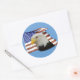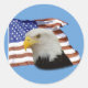 Una imagen de la cabeza de un águila calva sobre una bandera estadounidense ondeando en la brisa.