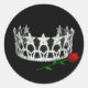 Pegatina redondo mostrado de negro con una foto impresa de una corona de reinas de concurso y una rosa roja. Personalizar este artículo o compra tal cual.