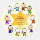 Apropiado para cualquier festividad judía (bueno, excepto días rápidos como Yom Kippur), este diseño presenta una gran estrella de David con nombres de varias festividades judías en el centro. Alrededor de la Estrella hay niños estilizados y coloridos con el atuendo adecuado para sus vacaciones. Festividad y diversión.