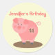 Pegatina de una fiesta de cumpleaños con el ilustracion de un cerdo rosado parado en un charco de barro. Personaliza el texto rosa y marrón. Busque invitaciones coincidentes y más en la categoría "Cumpleaños" de Jill's Paperie.