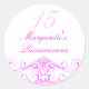 Este elegante pegatina personalizable Quinceanera cuenta con una tiara rosa y remolinos de fondo blanco. Personalizar añadiendo tus detalles en la letra de tu elección!