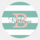 Fondo pastel en color turquesa, azul marino y coral con franjas blancas y un monograma doble en una combinación de letra de guión sérico y manuscrito.