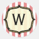Un pegatina con temática de circo con un fondo de rayas blancas y rojas descoloridas. Personalice con su marco inicial de soporte dorado delineado en negro. Invitaciones coincidentes disponibles en Jill's Paperie.