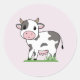 Un Pegatina Personalizado de vaca dulce con un fondo rosado. ¡Una forma divertida de personalizar tus cartas, productos lácteos o para la decoración de una granja!