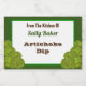 Un pegatina de recetas personalizado con alcachofas retro en las esquinas que dice "De la cocina de" con escritura verde editable y letras negrita marrones para tu nombre y receta, sobre un fondo verde cazador.